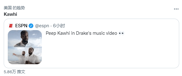 24直播网9月04日讯快船领袖科怀-莱昂纳德引热议,小卡在音乐巨星Drake新歌《Way 2 Sexy》《通往性感之路》MV中现身,首次在音乐MV中亮相,小卡面无表情,露出招牌的面瘫表情;如此事件冲上推特热搜引热议,美媒直呼小卡真的现身了。