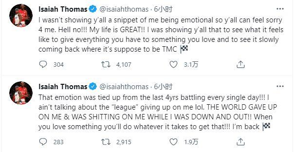 那种情绪是过去四年里每一天所做抗争的积压!我谈论的不是‘NBA联盟’放弃了我,哈哈。在我落魄之时,全世界都放弃了我,而且对我恶语相向!当你热爱某件事,你会倾其所有去得到它!我回来了。