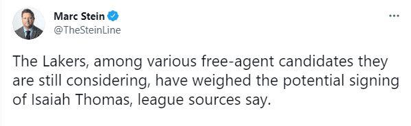 24直播网讯 此前小托马斯轰下81分后,坐在更衣室抱头痛哭的伤心画面引热议;据名记Marc Stein报道,湖人权衡过以赛亚-托马斯的签约可能性,上赛季他为鹈鹕出战3场比赛,场均7.7分1.7助攻。