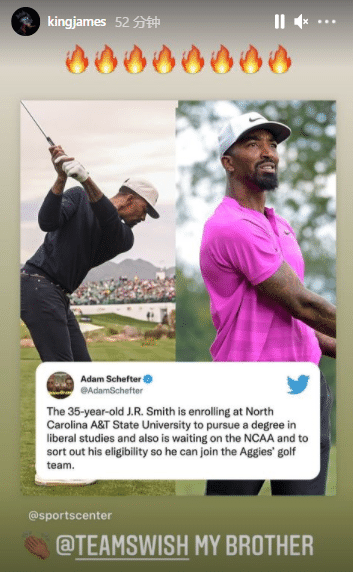 詹姆斯转发JR-史密斯攻读学位的喜讯,配文:我的兄弟,8个火表情。