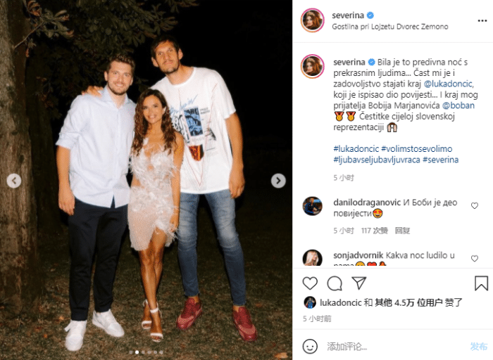 24直播网讯 正式和独行侠续签5年2.07亿美元超级顶薪之后,克罗地亚女歌手Severina晒出自己与两位球员一起开party庆祝画面,写道:美好的夜晚,美好的人!东契奇书写了历史,和他一起玩非常快乐,也是一种荣誉!还有我的好朋友博班!祝贺整个斯洛文尼亚队在奥运上取得的成绩!