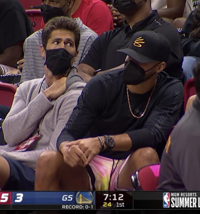 库里戴着一顶黑色棒球帽、黑色长袖T恤搭配鲜艳的短裤,和勇士总经理鲍勃-迈尔斯坐在一起,戴着金链子坐在场边观战;库里还接受美女记者的采访,直言相信勇士仍旧是一支强大的球队;今年休赛期,库里和勇士提前续约5年2.15亿美元超级顶薪,成为NBA历史首位签下两份2亿+合同的球员。
