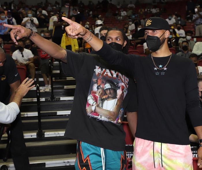 24直播网讯 北京时间8月12日,NBA夏季联赛勇士对战猛龙,场边大腕云集,库里、追梦格林以及勇士总经理等人都来了,库里戴金链子出镜并且接受采访,格林戴着东京奥运金牌十分抢镜;“妹夫”达米安-李和库里一同来到现场。
