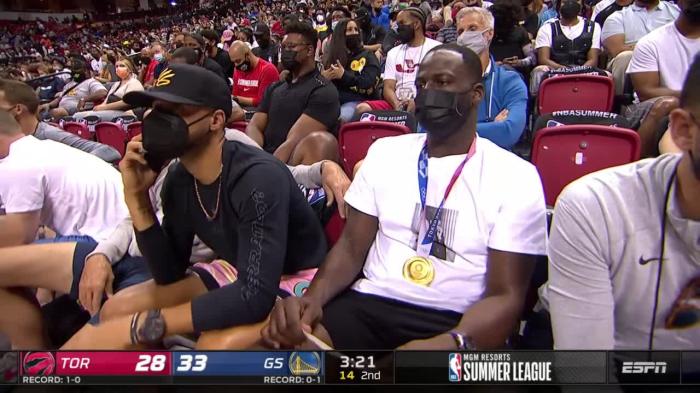 勇士另一球星德拉蒙德-格林是在第二节来到场边,身穿黑色短裤和白色T恤,戴着金灿灿的奥运金牌出镜,先是和总经理打招呼,鲍勃-迈尔斯两眼发光,之后格林和库里击掌,然后坐在库里傍边看比赛。