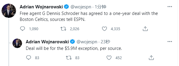 之后施罗德更新社交媒体,正式宣布加盟凯尔特人,晒出身穿绿军球衣照:我很自豪地宣布,我将在2021-2022赛季为波士顿凯尔特人效力,这是联盟历史上最好的球队,穿上绿军的球衣,是一件值得骄傲的事……谁做好准备了?