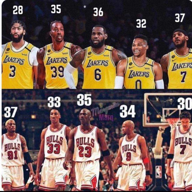 这支 湖人队的安东尼37岁,詹姆斯36岁,霍华德35岁,威斯布鲁克32岁,浓眉28岁。1998年夺冠时,那支公牛的核心阵容里,罗德曼37岁,乔丹35岁,哈珀34岁,皮蓬33岁,库科奇30岁。那一年的公牛也不年轻,但他们依然拿到了NBA总冠军。