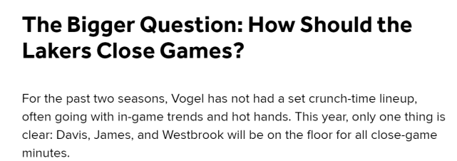至于比赛里的终结阵容,则有更多的可能性。唯一确定的是威少、浓眉和詹姆斯会在场上,和首发阵容不同,终结阵容要视场上的情形和对手战术而定。偏向进攻还是防守,会让沃格尔做出不同的选择。