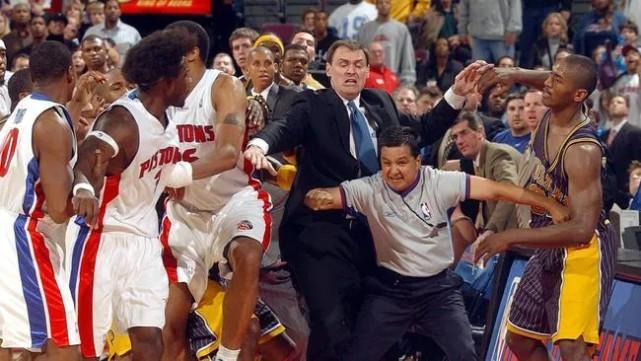 2004年11月19日,比赛还剩45.9秒,活塞落后步行者15分,比赛胜负已经没有悬念。活塞中锋大本试图扣篮时,阿泰斯特的犯规动作过大,招致本的不满。他重重地推了阿泰斯特一把,阿泰被劝到场边,他躺在裁判席上冷静的时候,一个球迷把饮料杯丢在阿泰的身上,直接激怒了阿泰。步行者球员和活塞球迷也发生冲突,双方9名球员累计被禁赛140多场比赛。