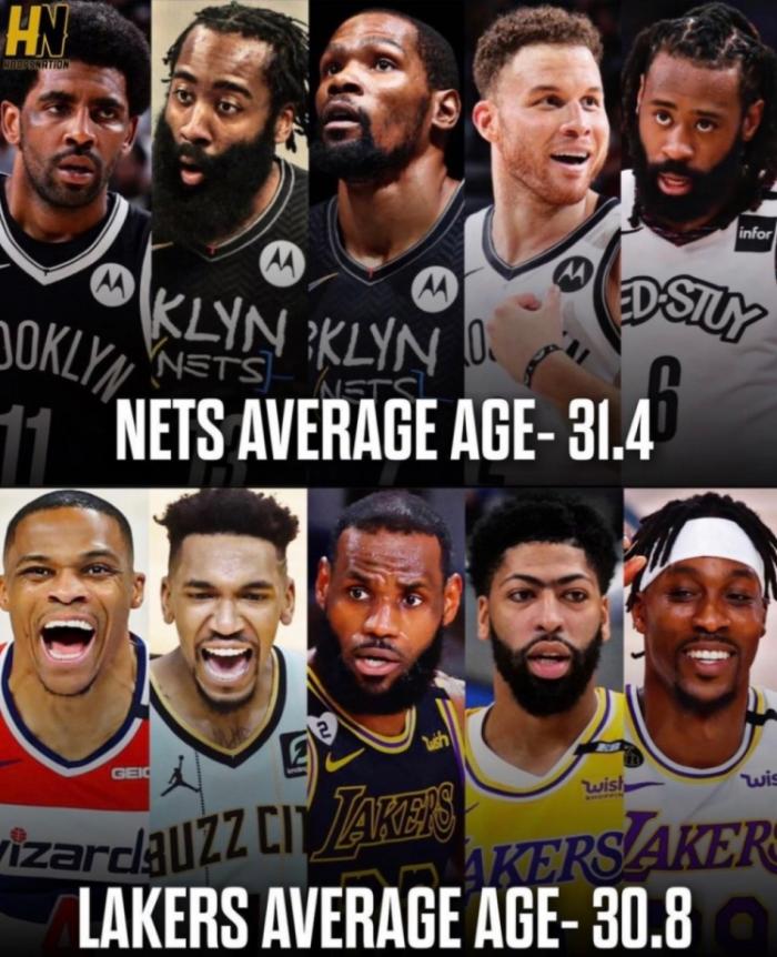 24直播网讯 北京时间8月9日,美媒晒了一组有趣的对比,湖人和篮网的潜在首发5人组平均年龄分别是30.8岁和31.4岁,没想到吧,篮网的平均年龄更大!