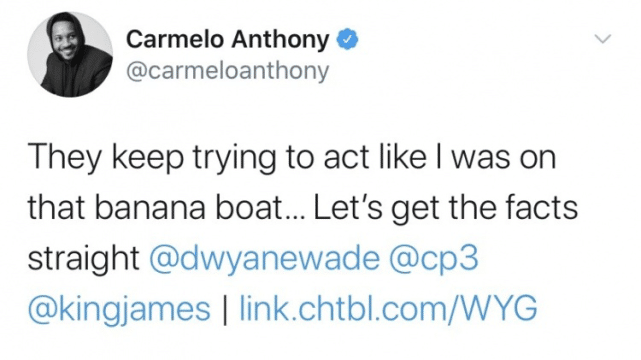 不仅仅安东尼在直播中这么说,在社交媒体上安东尼同样在发声:“他们一直在说我就在那条香蕉船上吗,让我们把事实说清楚@詹姆斯@保罗@韦德。”其实仔细看看那张香蕉船兄弟们的照片,排在第一的是尤尼恩,排在第二位的是韦德,第三位的是保罗,第四位的是詹姆斯。根本没有安东尼在场,之后关于安东尼在那条香蕉船上的故事只是后来球迷们自己杜撰的,但是这个故事还是传开了,因为这兄弟几人太亲密了。