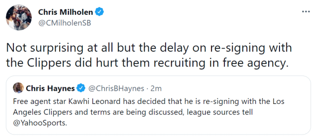 24直播网讯 北京时间8月7日,据名记克里斯-海耶斯报道,自由球员科怀-莱昂纳德已经决定他将和快船续签合同,目前双方正在讨论合同的具体条款和细节。