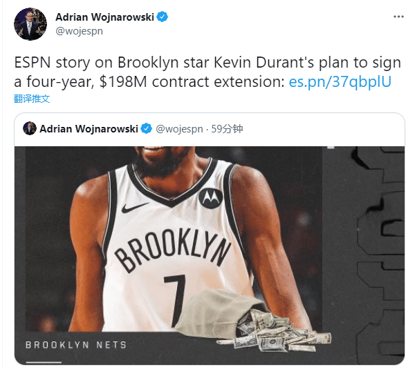 24直播网讯 北京时间8月7日,据名记沃纳罗斯基报道,杜兰特已经决定提前和篮网续约,双方将签下一份4年1.98亿美元的大合同,提前恭喜32岁杜兰特,跟腱断裂也挡不住他的超级巨星。