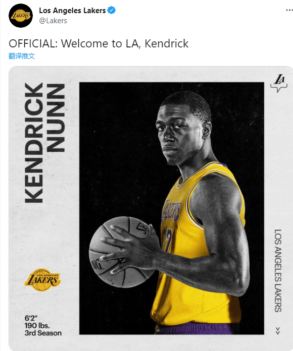 湖人晒出新援纳恩签约的画面,并且官宣:欢迎来到洛杉矶。