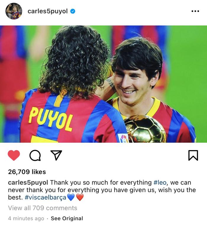巴萨官宣梅西离队后,卡莱斯-普约尔第一时间更新动态,写道:非常感谢你所做的一切,我们永远无法感谢你给我们的一切,祝你一切顺利!