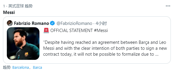 24直播网讯 北京时间8月6日,巴萨官宣梅西离队,由于经济和制度因素的制约,双方无法完成签约,因此梅西将不再为巴萨效力,球队为此深表遗憾。梅西正式离队引热议,冲上推特热搜榜第一名,美媒晒出梅西身穿湖人10号球衣的P照,火箭,马刺官方直接招募。