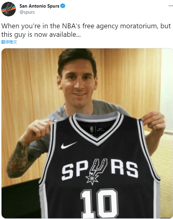 马刺官推晒出梅西手持马刺10号球衣照,写道:现在正是NBA自由市场开启阶段,这个男人也是可以签约的。