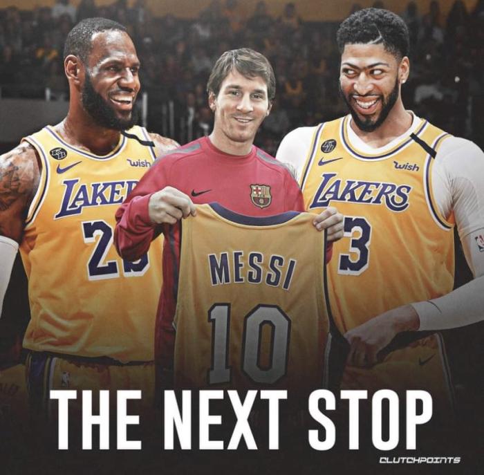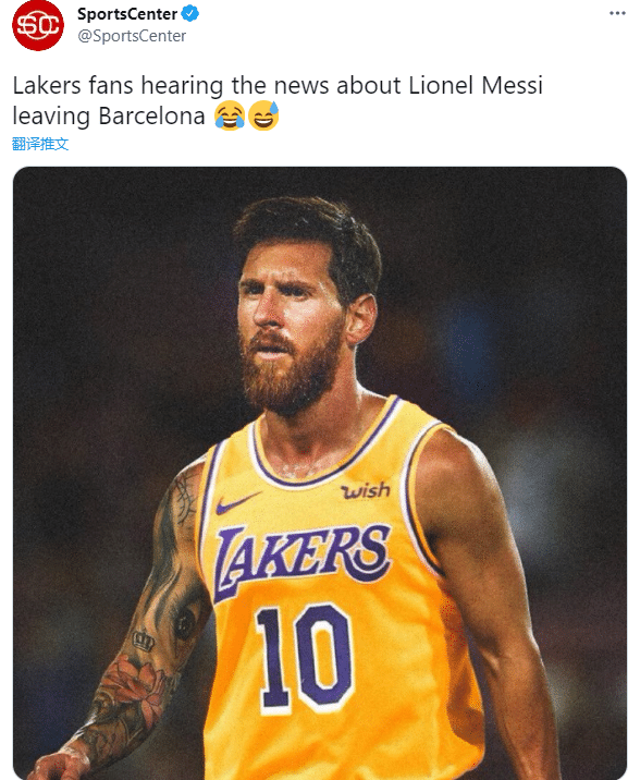美媒Sports Center晒出梅西身穿湖人10号球衣的P照,并且发推:当湖人球迷听到梅西离开巴萨;ClutchPoints则是晒出梅西手持湖人10号球迷与詹姆斯、浓眉合体的P照;更有球迷调侃梅西的年龄适合湖人。