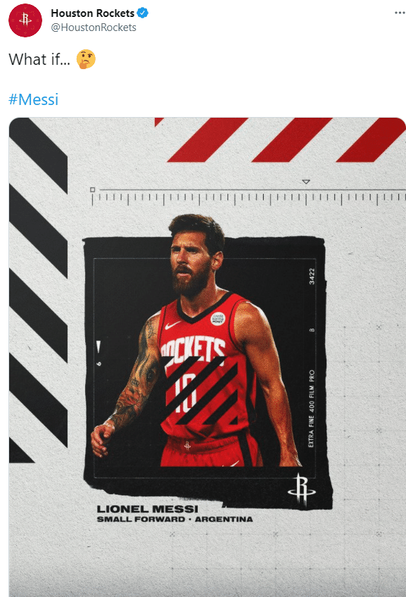 火箭官方发推:假如梅西加盟会怎么样;晒出梅西身穿火箭球衣的P照,简介中配文:梅西,小前锋,来自阿根廷。