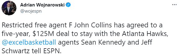 24直播网讯 北京时间8月4日,特雷-杨之后,又和核心球星续约老鹰,据espn名记沃纳罗斯基报道,自由球员约翰-科林斯已经同意5年1.25亿美元续约老鹰,最后一年拥有球员选项;24岁新星续约老鹰,未来继续联手特雷-杨冲击总冠军。