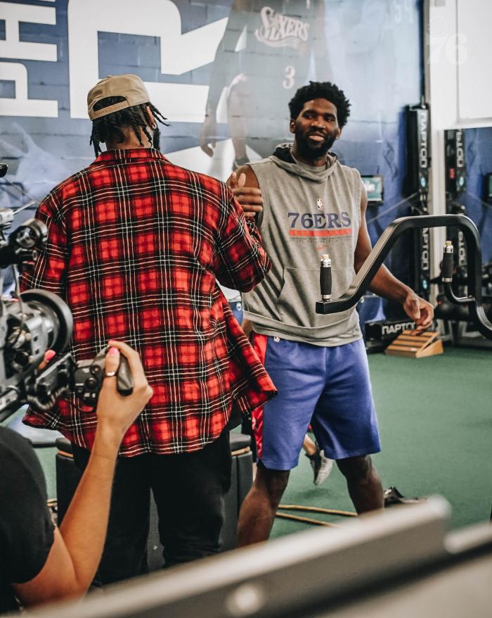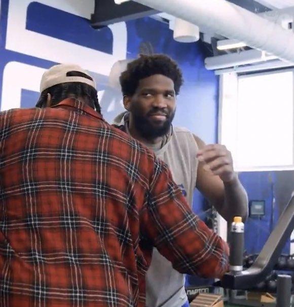 当时恩比德正在健身房训练,庄神和恩比德击掌并且拥抱,如此一幕引热议,恩比德拥抱庄神的眼神十分抢镜。