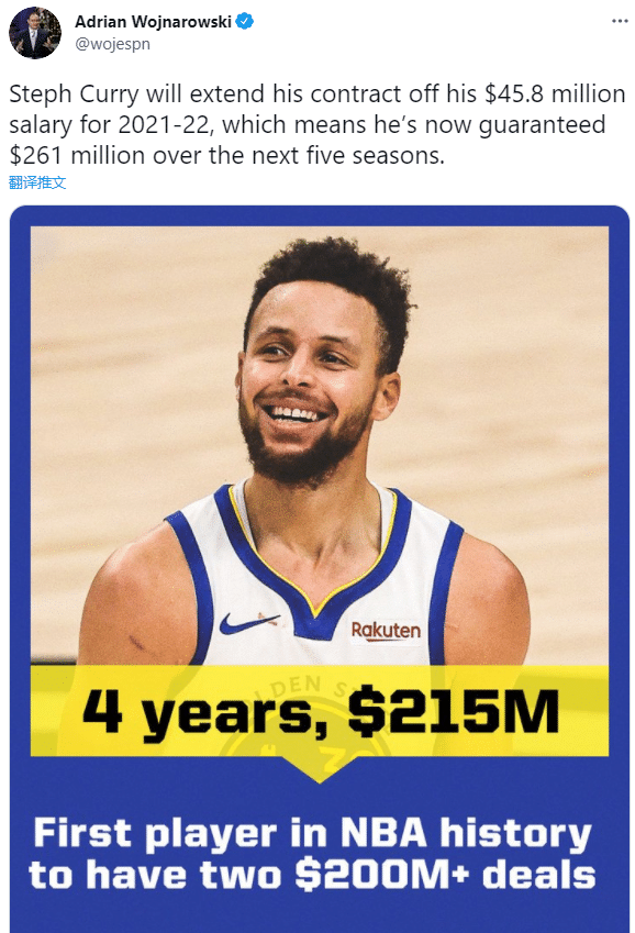 薪资专家Bobby Marks披露了库里新合同具体细节,他现在的合同还剩下一年,薪资是4580万美元。