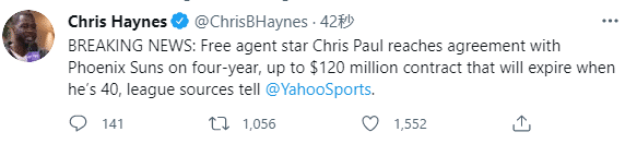 24直播网讯 北京时间8月3日,NBA自由球员交易市场正式开启,36岁的保罗继续留在太阳,据名记海耶斯报道,保罗已经和太阳达成续约合同,双方签约4年1.2亿美元大合同,合同将在他40岁时到期,新赛季保罗继续联手布克冲击总冠军。