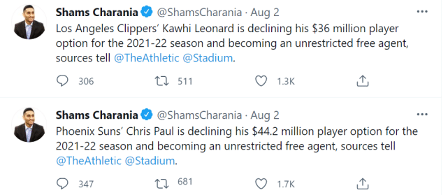 24直播网讯 北京时间8月2日,据名记查拉尼亚道,太阳球星保罗和快船球星莱昂纳德都计划拒绝执行下赛季的球员选项,他俩都将成为不受限制的自由球员。保罗下赛季的年薪是4420万美元,小卡下赛季的年薪是3600万美元,两人都有望重新签下一份多年合同。