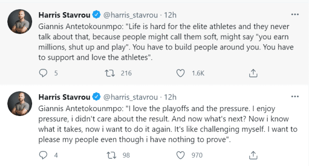 字母哥在采访中还谈到自己在夺冠之路上的心态。“对于精英级别的运动员来说,生活真的很难,但他们不会谈到这点。因为人们可能会说他们软,可能会说‘你都赚了上百万了,闭嘴好好打球吧’。人们应该支持运动员。”