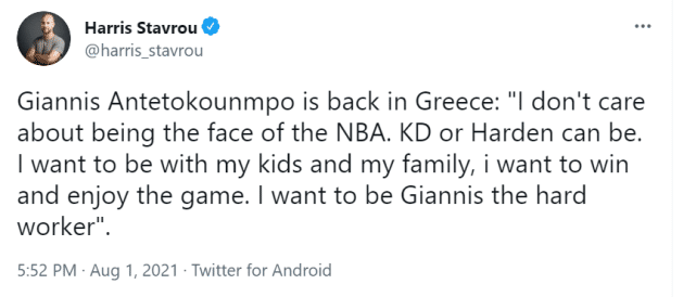 24直播网讯 北京时间8月2日,字母哥带着总冠军奖杯和FMVP奖杯回到祖国希腊,并接受了希腊媒体的采访。在采访中,字母哥坦言自己并不在乎是否成为联盟的门面球星,他认为杜兰特或者哈登可以扮演这个角色。