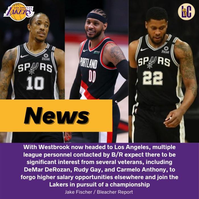 据美国记者Jake Fischer报道,多名联盟内部人士透露,随着威少加盟湖人,多位老将很有兴趣降薪加盟湖人“这些老将包括德马尔-德罗赞、鲁迪-盖伊和卡梅隆-安东尼等球员,他们很有兴趣放弃高薪机会,而选择加盟湖人来追逐总冠军。”