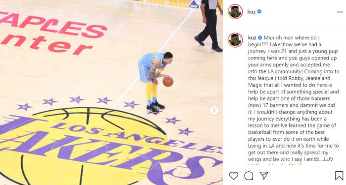 24直播网讯 北京时间7月31日,昨天湖人通过一笔交易把库兹马在内的多名球员打包送到了奇才,换回了三双机器威少。库兹马从登陆NBA后就一直在湖人打球,在被交易后,库兹马今天也是在社媒上发长文感谢了紫金军团,表示自己深爱洛杉矶,一日紫金终身湖人。