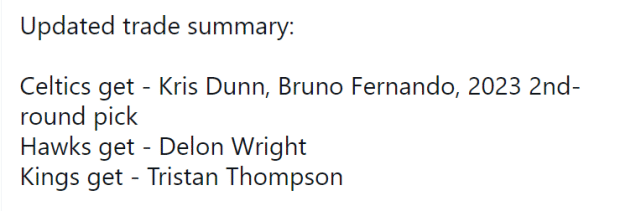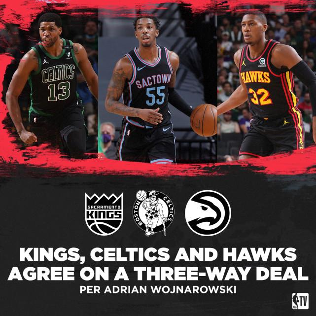 24直播网讯 北京时间7月31日,国王、凯尔特人和老鹰正式达成了一笔3队5人交易协议。凯尔特人得到老鹰的后卫克里斯-邓恩、前锋费尔南多、2023年的次轮签(来自老鹰),国王得到凯尔特人的中锋特里斯坦-汤普森,老鹰得到国王的后卫德朗-莱特。