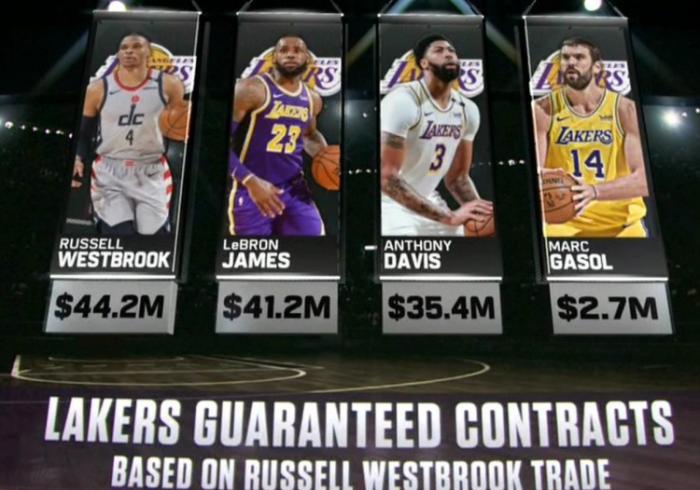据统计,在湖人的保障合同中,威少下赛季以4420万美元居首,詹姆斯以4120万美元次之,第三是浓眉的3540万美元,小加则是270万美元。他们薪资空间没剩多少,余下做交易的可能性比较低,因为没有筹码了,除非是与庄神、小塔克先签后换,但是可以用中产特例和老将底薪来签人!