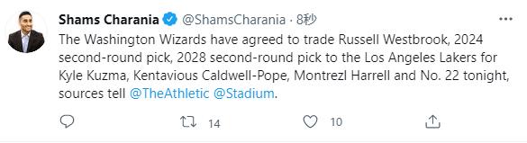 这笔交易的详情为奇才送出威少、2024年和2028年的二轮签,换回库兹马、波普、哈雷尔和今天选秀中的22号首轮签。也就是说,奇才是3换4,用威少得到了三位具备非常出色即战力的球员和一个首轮签,但据此前报道他们可能不会全部留下湖人三将。