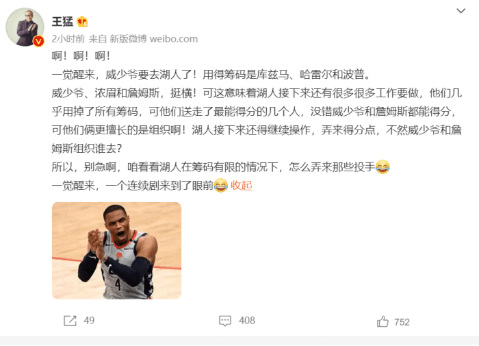 而湖人则是重点被关注的,他们得到了威少,正式组成了三巨头阵容,与詹眉联手向总冠军发起冲击!据悉威少和詹姆斯两人本就私下关系不错,威少本人也是洛杉矶人,Shams爆料他早已做好准备冲击生涯第一冠了,作为本赛季首轮被太阳淘汰的湖人,他们急需这位大牌带队重返争冠行列!