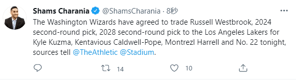 奇才把威少交易到湖人,而威少本人也想换个地方继续生涯,湖人便是他的首选目的地,他一直想要回到洛杉矶;这笔交易涉及的主要球员已经确定,关键是在选秀权补偿还在商讨,最终双方达成一致,湖人把库兹马、波普、哈雷尔、今年22号首轮签送到奇才,从而引援威少、2024 年第二轮选秀权和 2028 年第二轮选秀权。