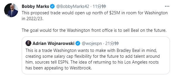 名记沃纳罗斯基表示,这是奇才希望能让比尔满意的交易,球队通过这个交易可以获得未来薪资空间上的灵活性,从而为比尔引援新的帮手;这笔交易能让奇才在2022-23赛季获得2500万美元的薪资空间;现在比尔根本不想离队。