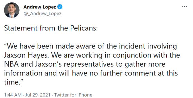 鹈鹕官方也已经就此事发表声明:“我们已经获悉海耶斯的事件,我们会与NBA以及海耶斯的代表人一起收集更多的信息,目前不会发表更多评论。