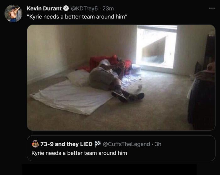不久前,有人暗讽篮网三巨头,杜兰特晒出一张别人独自睡地上刷手机的图片,并且借用别人的话“欧文需要一直更好的球队”。