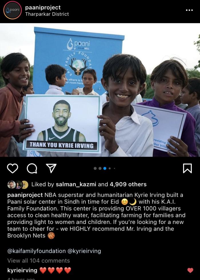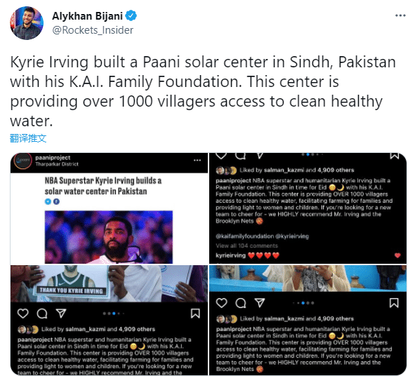 欧文和他的基金会已经在巴基斯坦建造了一个太阳能供水中心,该中心正在为 1000 多名村民提供清洁用水;虽然欧文场外举动多次引争议,但欧文的善举确实令人感动。