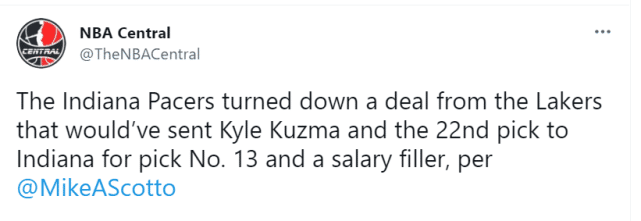 24直播网讯 北京时间7月28日,据NBA记者Michael Scotto报道,消息人士透露,湖人希望打包库兹马和22号签换步行者的13号签和配平薪金的筹码,但是被后者拒绝。本赛季常规赛,库兹马场均12.9分6.2篮板1.9助攻,可季后赛只有场均6.3分3.8篮板1.2助攻的表现,投篮命中率29.2%,三分命中率17.4%,状态相当低迷。