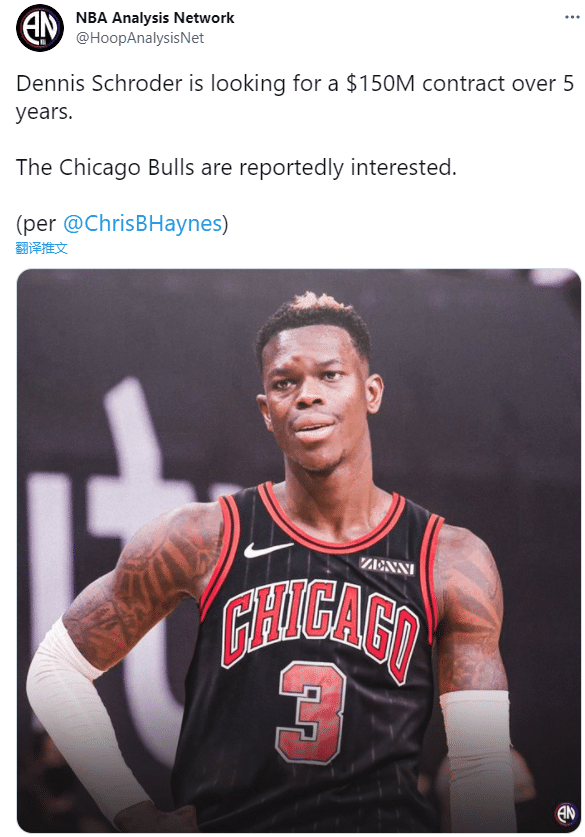 24直播网讯北京时间7月27日,据名记ChrisHaynes的报道,湖人球员丹尼斯-施罗德正在寻找一份5年1.5亿美元的续约大合同,平均年薪高达3000万美元;名记还透露芝加哥公牛有意引援施罗德。
