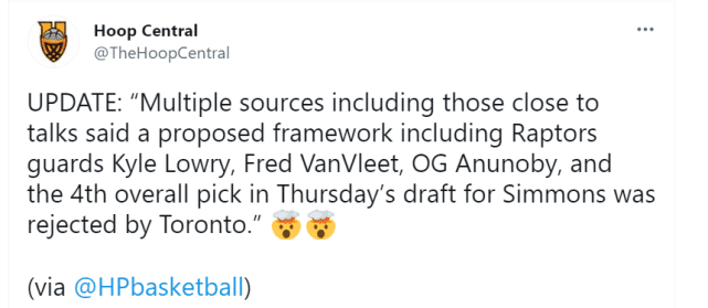 猛龙确实对西蒙斯有兴趣,但如果对方漫天要价,猛龙应该也不会傻到同意这样过分的要求。