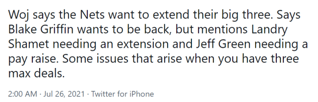 篮网也面临被对手挖角的风险,沙梅特的合同还剩一年,他希望能够和篮网提前续约。合同到期的杰夫-格林已经成为多支球队的目标,其中就包括雄鹿。雄鹿如果在自由球员市场上失去波蒂斯,他们希望引进格林作为替代者。格林在2020-21赛季只签了底薪,新合同他想要涨薪水。