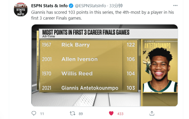 第七。字母哥在总决赛前3场比赛一共砍下103分,在生涯前三场总决赛中,仅次于里克巴里的122分、艾弗森的106分以及威利斯里德的104分!