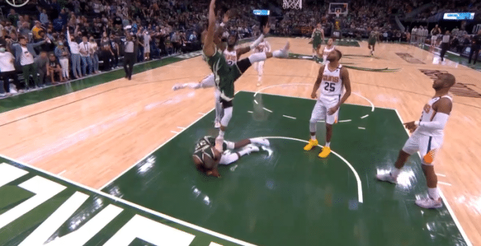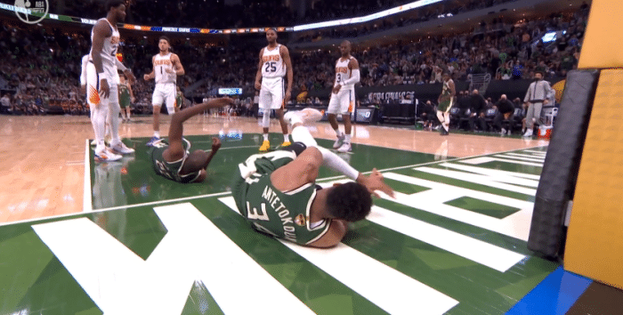 惊险!字母哥踩到米德尔顿重摔倒地,太阳悍将隔扣塔克引争议