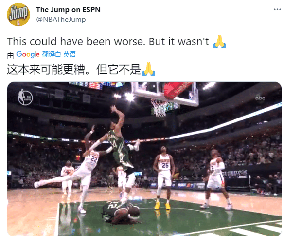 对于这惊险一幕,美媒The Jump on ESPN发推:这本来可能更糟,但它没有发生(祈祷)。