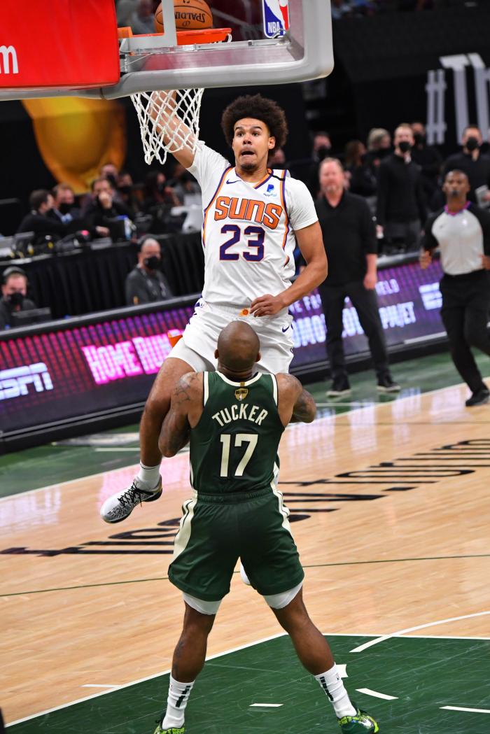 太阳23号球员卡梅隆-约翰逊隔扣塔克太狠,后者坐在地板上一脸不敢相信的表情——张嘴并瞪大双眼。
