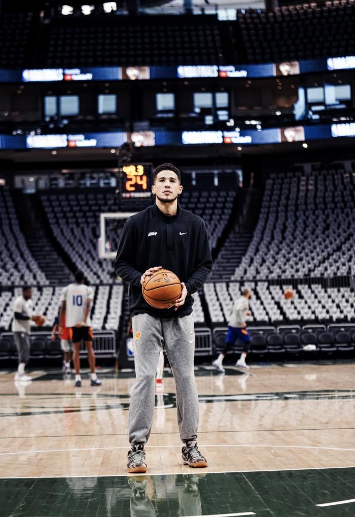 布克同样专注于训练,不过训练之余,布克咧嘴大笑乐开怀,如此一幕可以看出太阳全队认真训练,队内氛围也特别好;此前采访时,布克表示客场比赛能让球队更加团结,防守从来不是一个人的事。