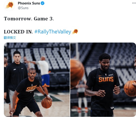 24直播网讯 北京时间7月11日,太阳全队早已飞抵密尔沃基,众球员已经在雄鹿主场全力备战总决赛G3;太阳官方晒出球员训练照,发推:锁定总决赛第三场。